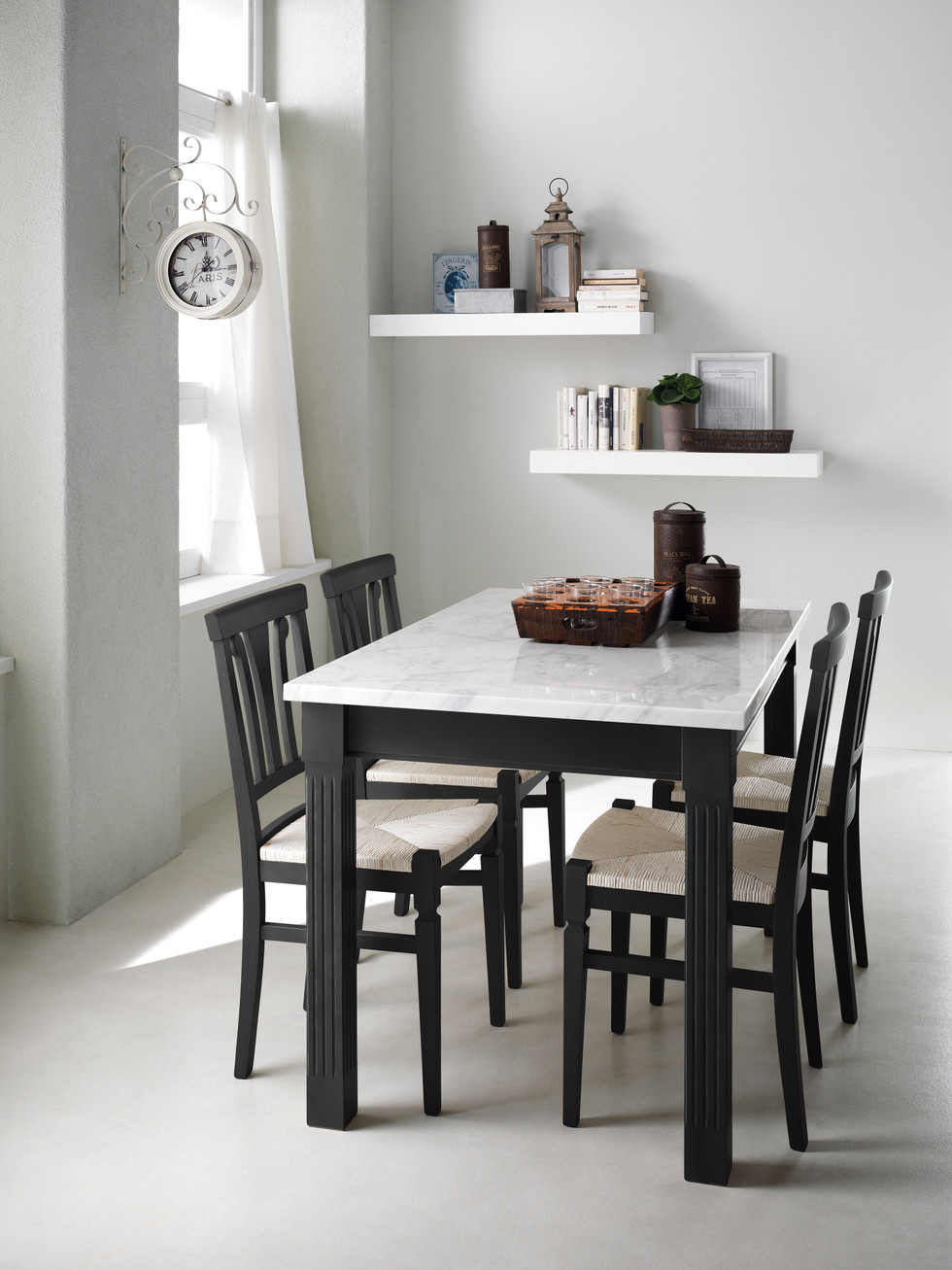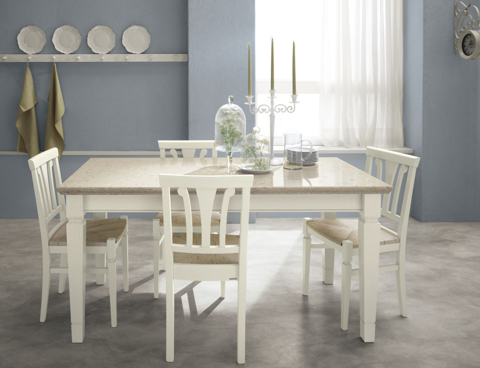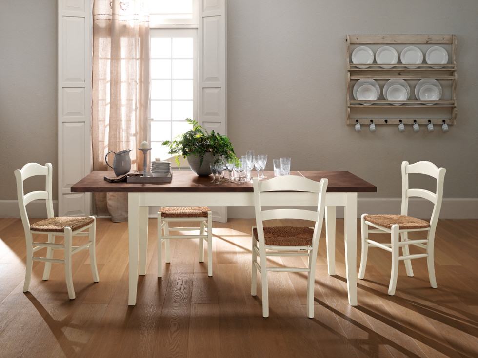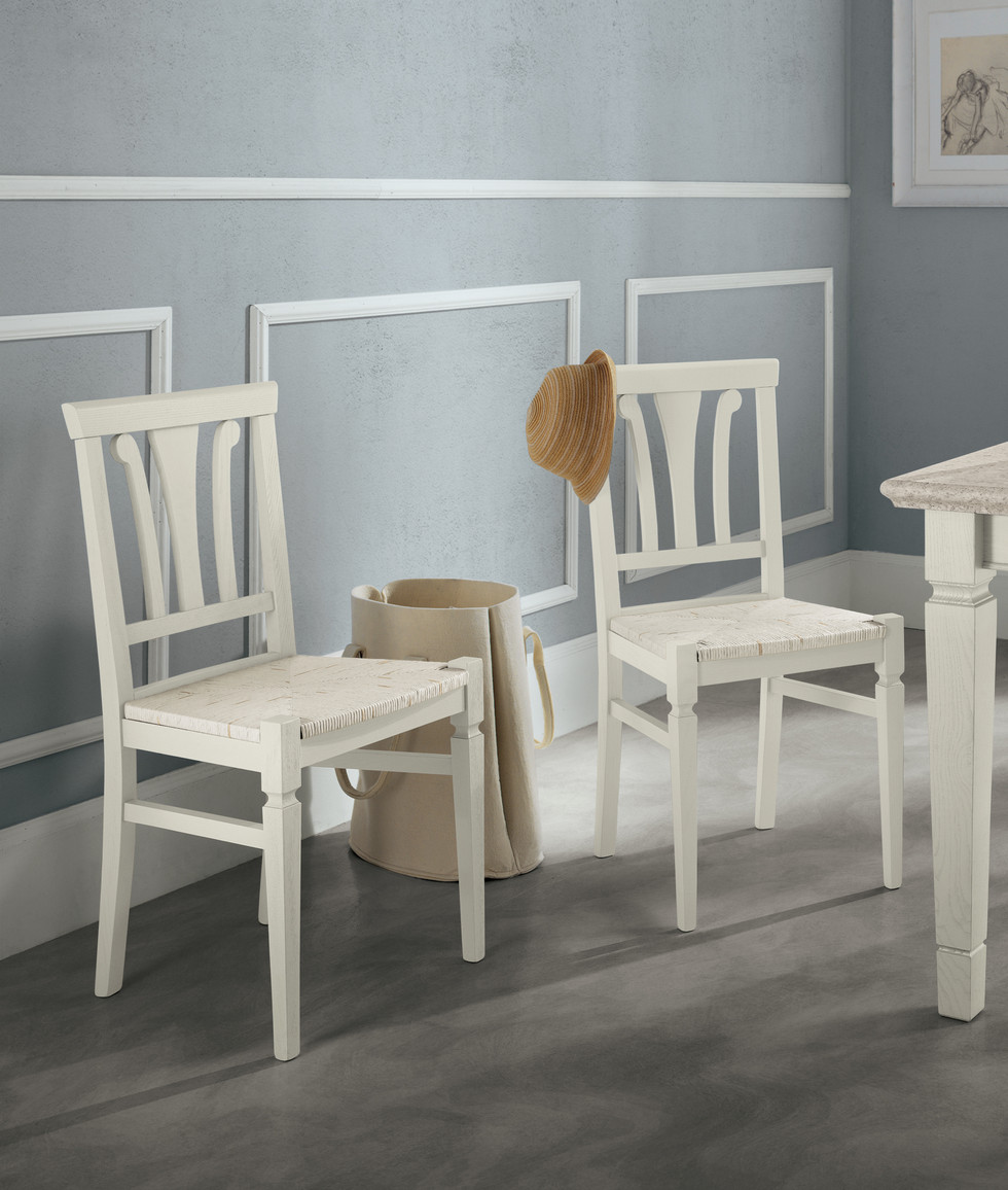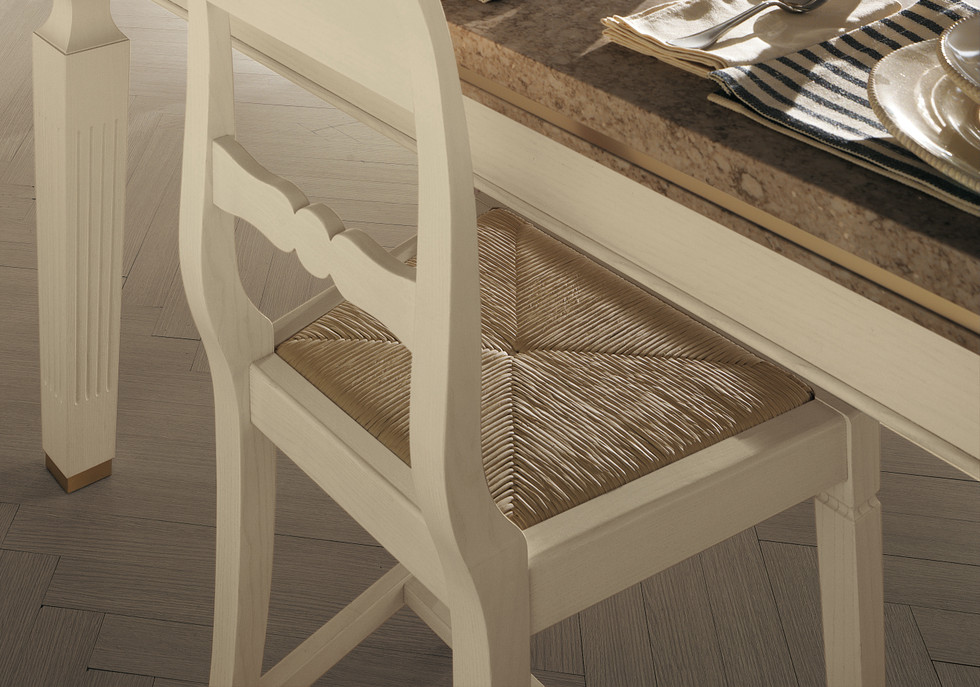 Solutions that recall kitchens of old: the wooden grids, the chimney-shaped hood, the classic decorative elements on the fronts lend this version of Madeleine with Butter White Ash doors a splash of charm.