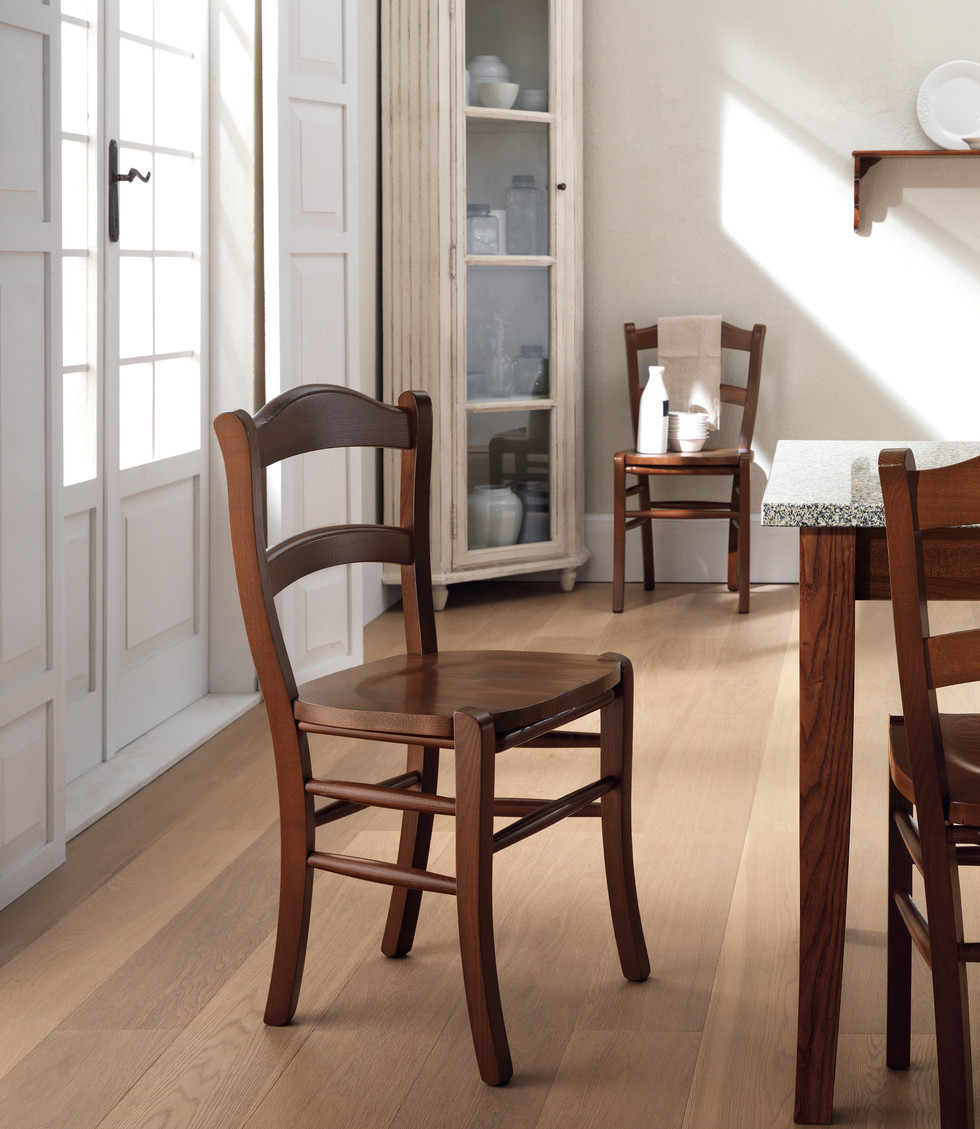 Like kitchens from another era, Madeleine in the Chestnut version is an invitation for sociability: the openfronted end units (available for base units, islands and tall units, as in this particular configuration) provide for outstanding modularity.
