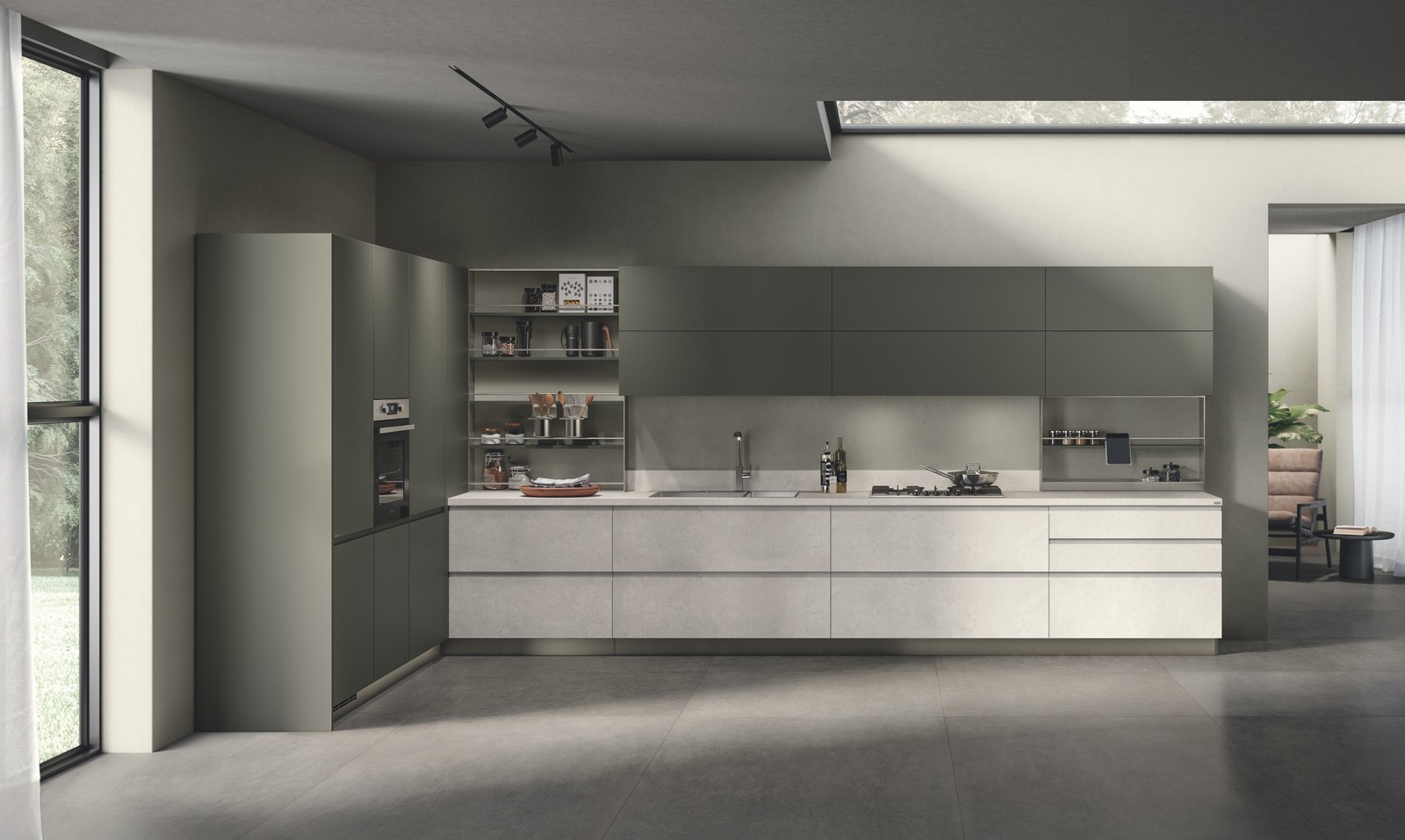 转角组合,配有Solar石色三聚氰胺饰面门板和矿石绿哑光烤漆门板。