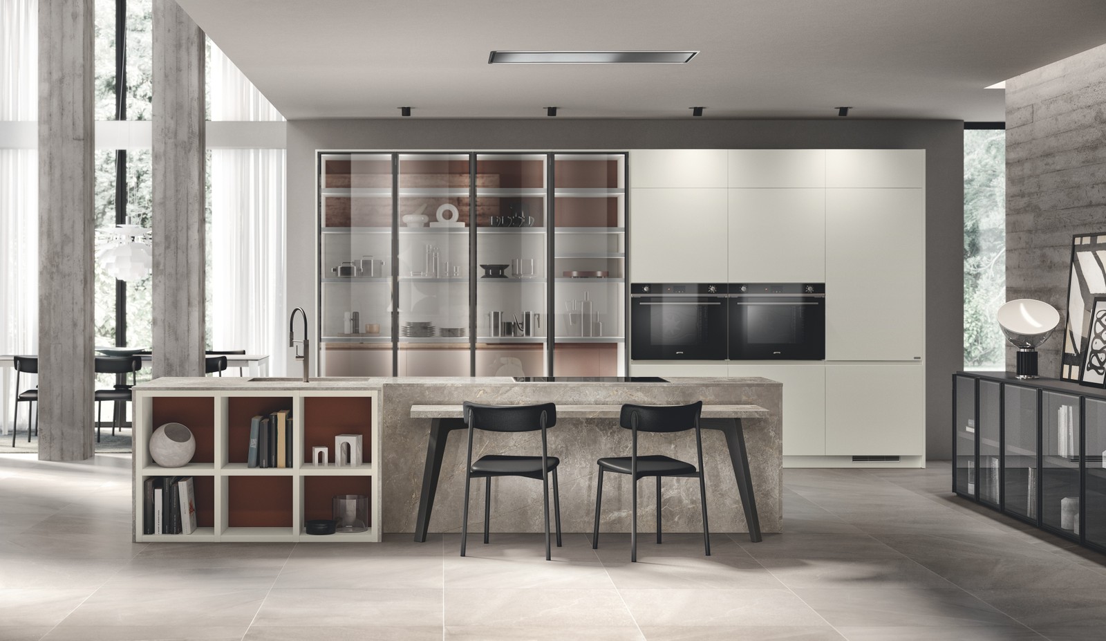 岛台组合,配有铁灰色和Soft Beige三聚氰胺饰面门板和Screen玻璃 配深色钢饰面铝框架门板
