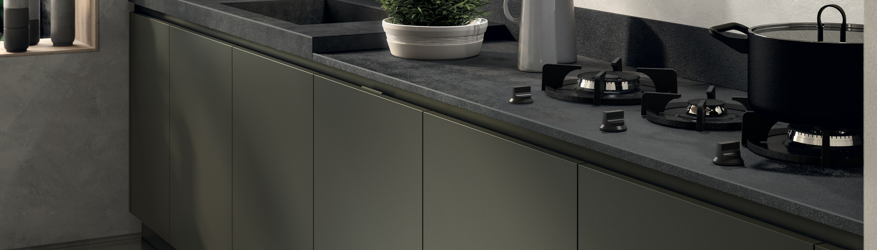 在这个系列中,溴灰色的FenixNTM®台面和门板,新款手柄采用哑光黑色轧齿镶件,配有可见螺丝和黑色踢脚线(高10厘米),这些装饰元素突出了该厨房系列的大都市灵魂。