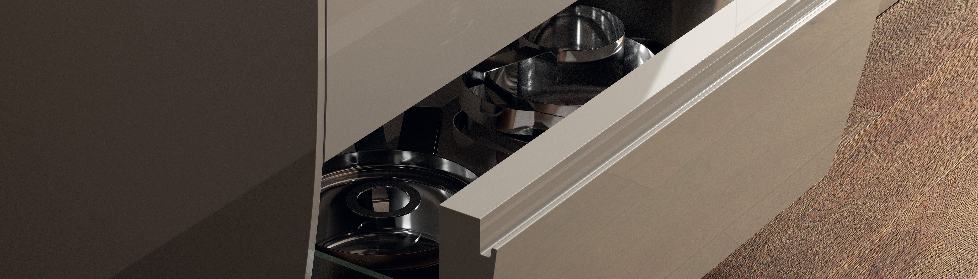 Flux Swing通过极简风格和新元素,突出现代精致的设计感,诠释起居区和厨房区的完美关系,打造优雅的功能性厨房。在这个系列中,其中一个优雅的细节:无把手中央凹槽。弯曲地柜的下层拉篮的抓握在门板上。