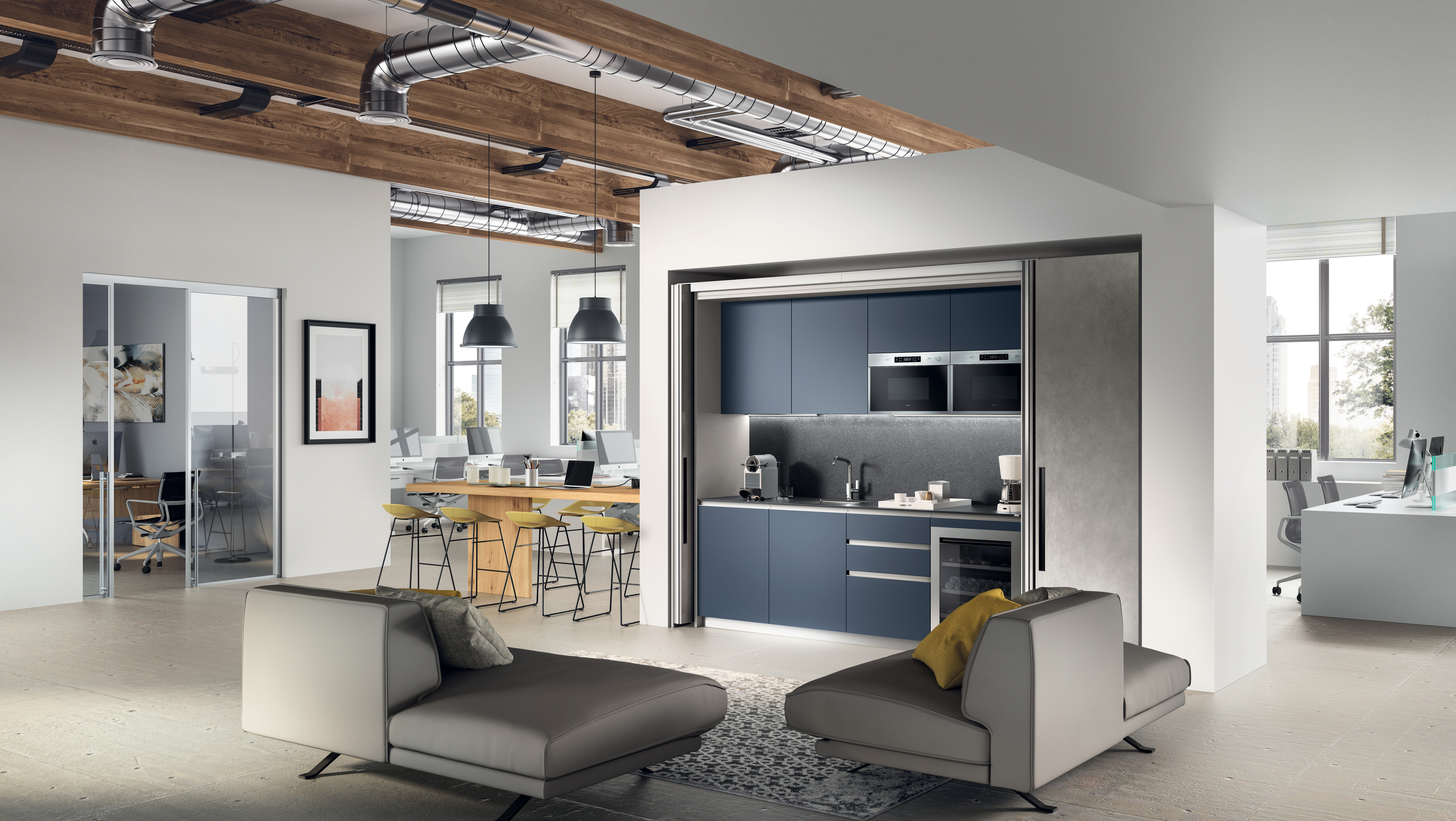 因此,您不仅可在诸如小型公寓和单房公寓等窄小的空间内拥有厨房角落、水槽、冰箱、烤箱、洗碗机、洗衣机、烘干机,也可在办公室拥有一个可以轻松转变为午休共用区的房间。