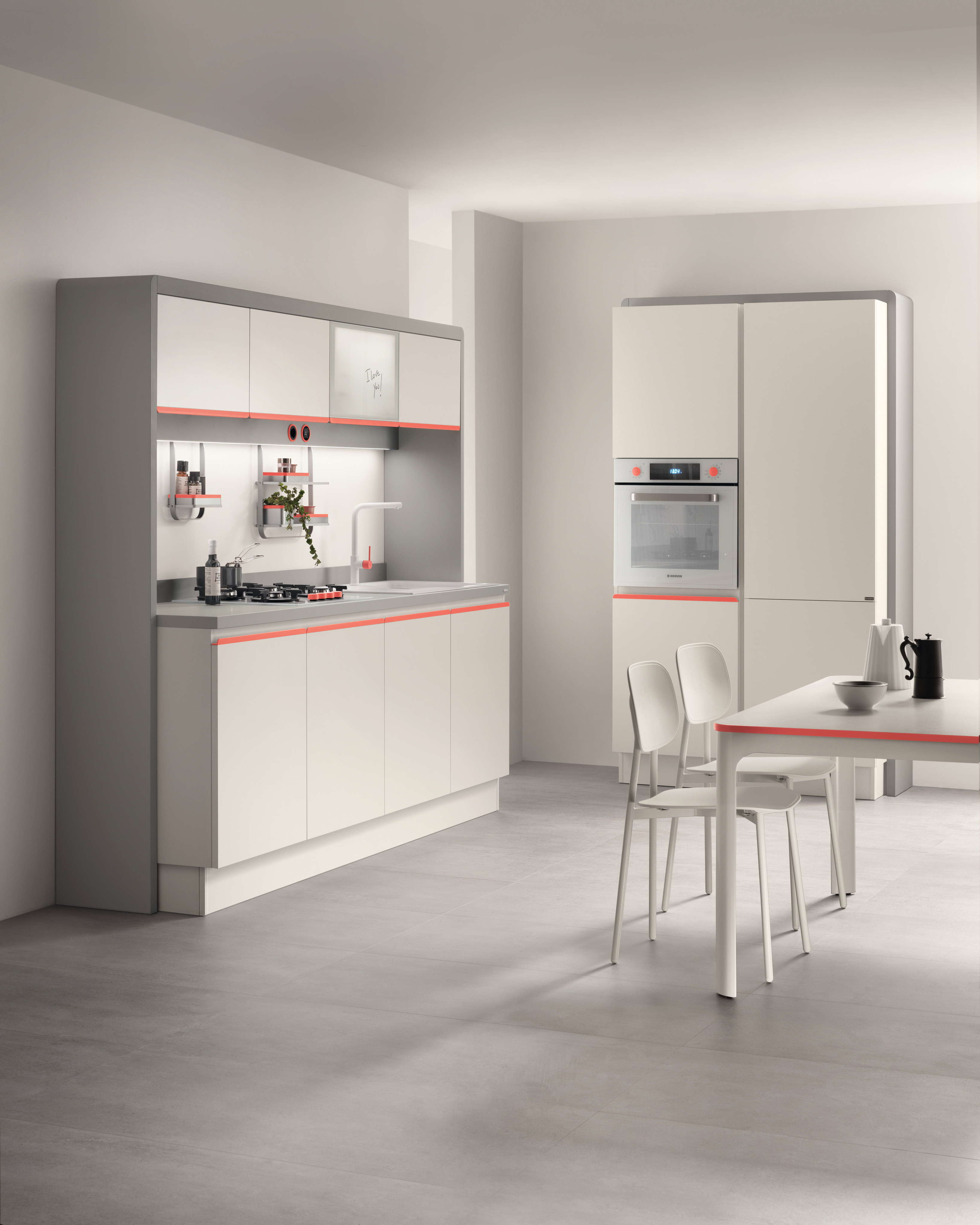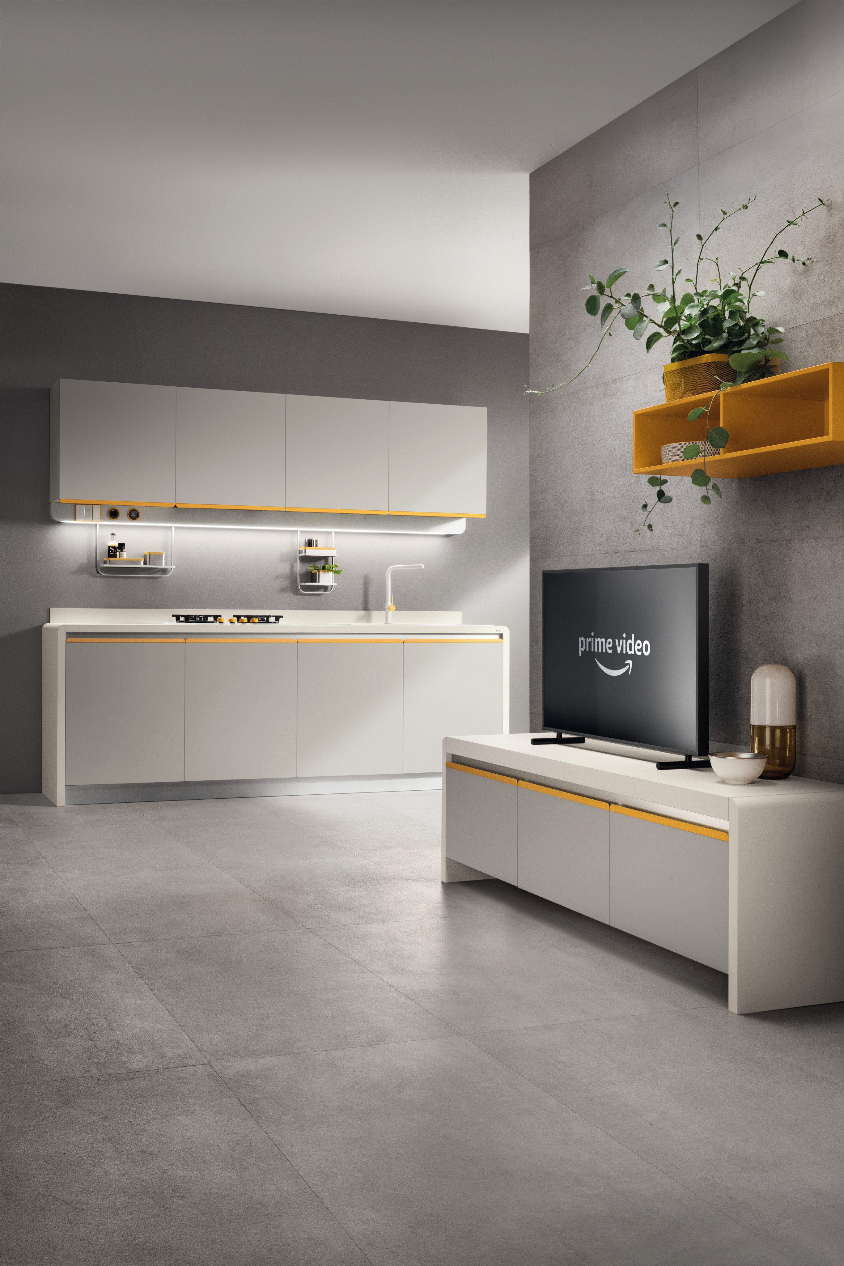 Dandy Plus系列起居室的设计以其简约的形式与其他空间相连。通过与厨房保持一致的美观选择,可以创造一个均匀且相互连接的环境:桥式元素也返回起居室,裹住电视柜的地柜,例如彩色再生塑料把手。尽管添加了大胆的颜色,开放式元素仍通过几何和线性形状散发着严谨的气息。不同环境之间的连接元素是餐桌,后者具有大胆的色调和圆润柔和的线条。