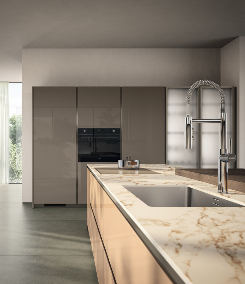厨房的个性化设计涵盖了整体组合的每一个细节,包括家具门板:采用独特的40°斜切设计,提供配有玻璃和铝框架的选择,并可根据喜好选择不同的饰面;或可选Air Box版本,它配备隐藏式铰链,带来无可比拟的简洁外观。