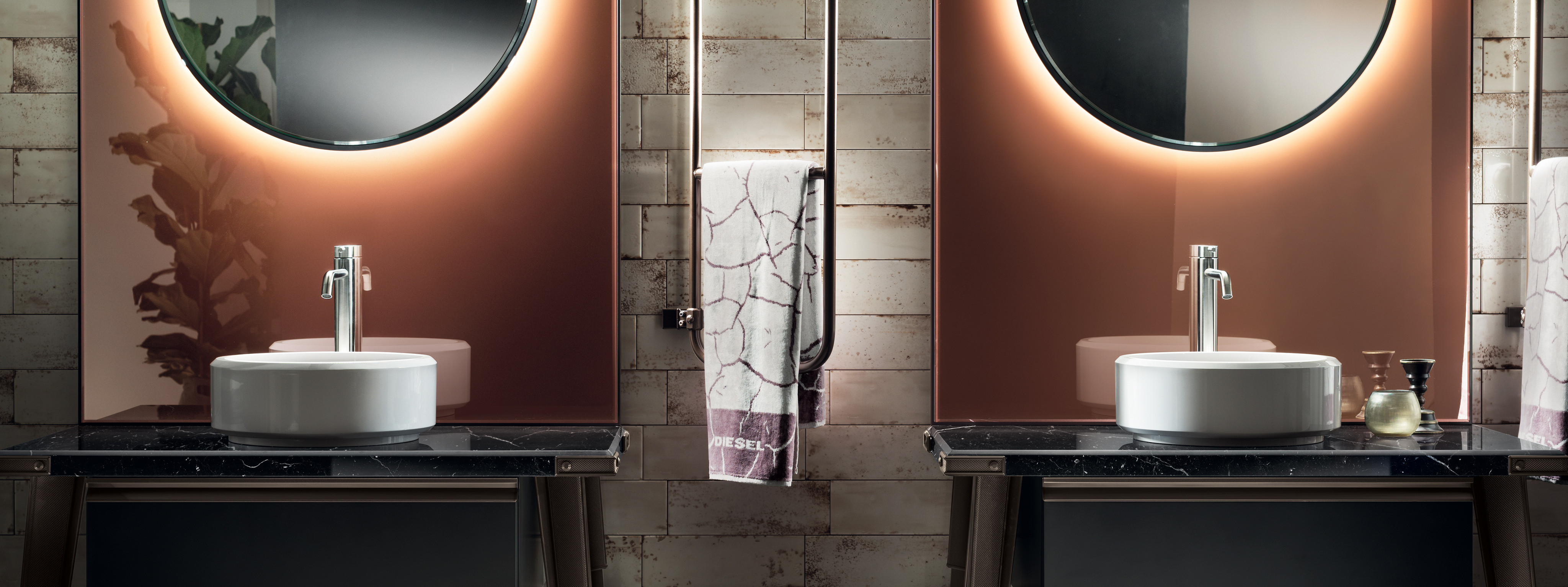 增加洗涤区亮度的材料很多:从台面或墙砖上的镜面到门板的玻璃,从浴室家具的金属轮廓到光亮的饰面。Diesel Open Workshop系列的带台下双水槽和配有Ribbed Glass玻璃门板的拉篮套系组件,在Corian ®深基岩台面搭配下更显突出。具有喷漆封边和青铜饰面的一对Lunar镜子,通过强调其线条的周边照明变得更加明亮。