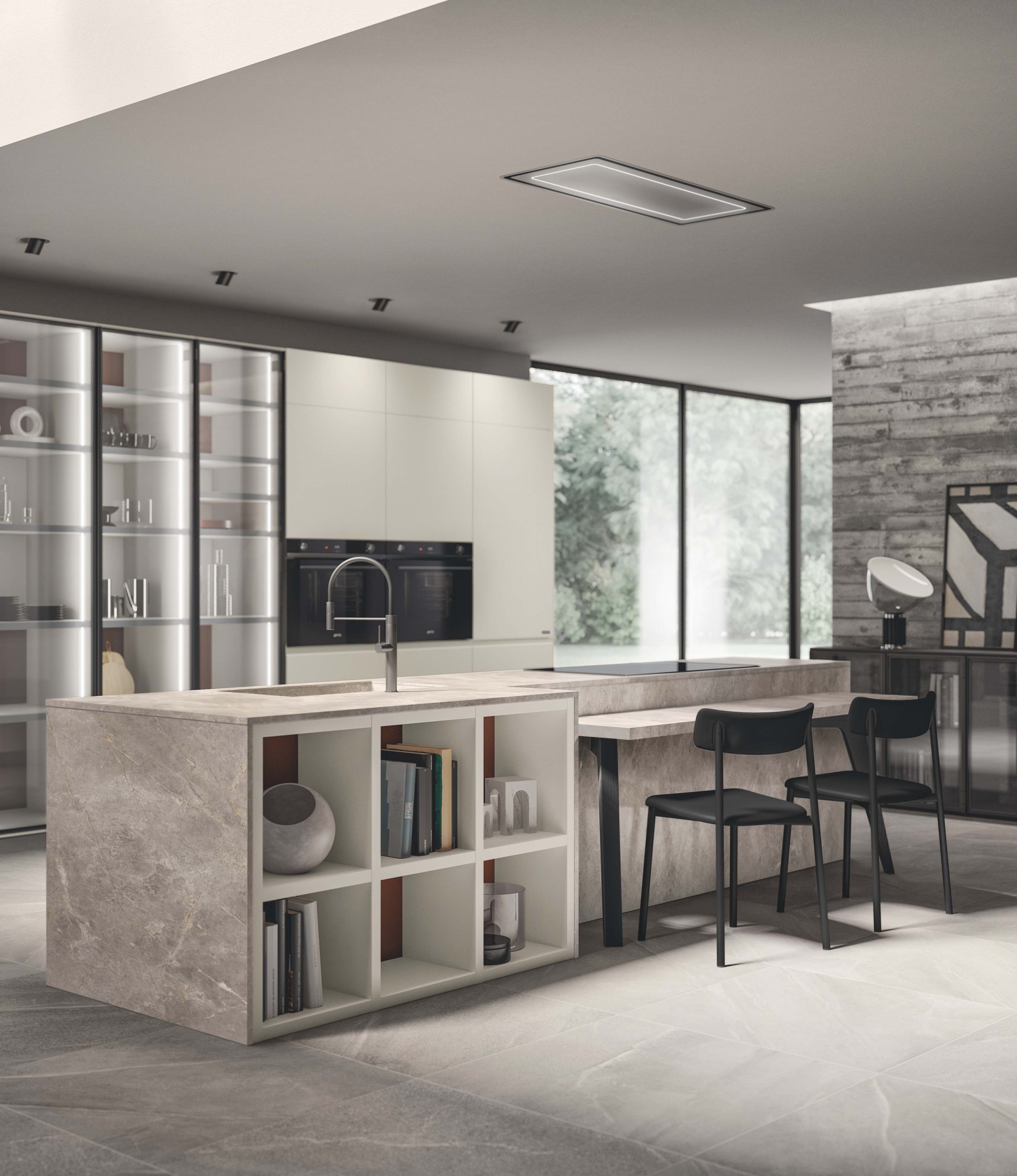 可以定位不同的存储和烹饪区域,以便能够区分这两个区域:它们一起有助于创建一个宜居的地方,在这里可以将搁板作为支撑平面插入,以创造一个通风和明亮的环境,并且可见区域和封闭区域交错,而在餐点吧台,除了准备和进餐外,您还可进行其它活动。