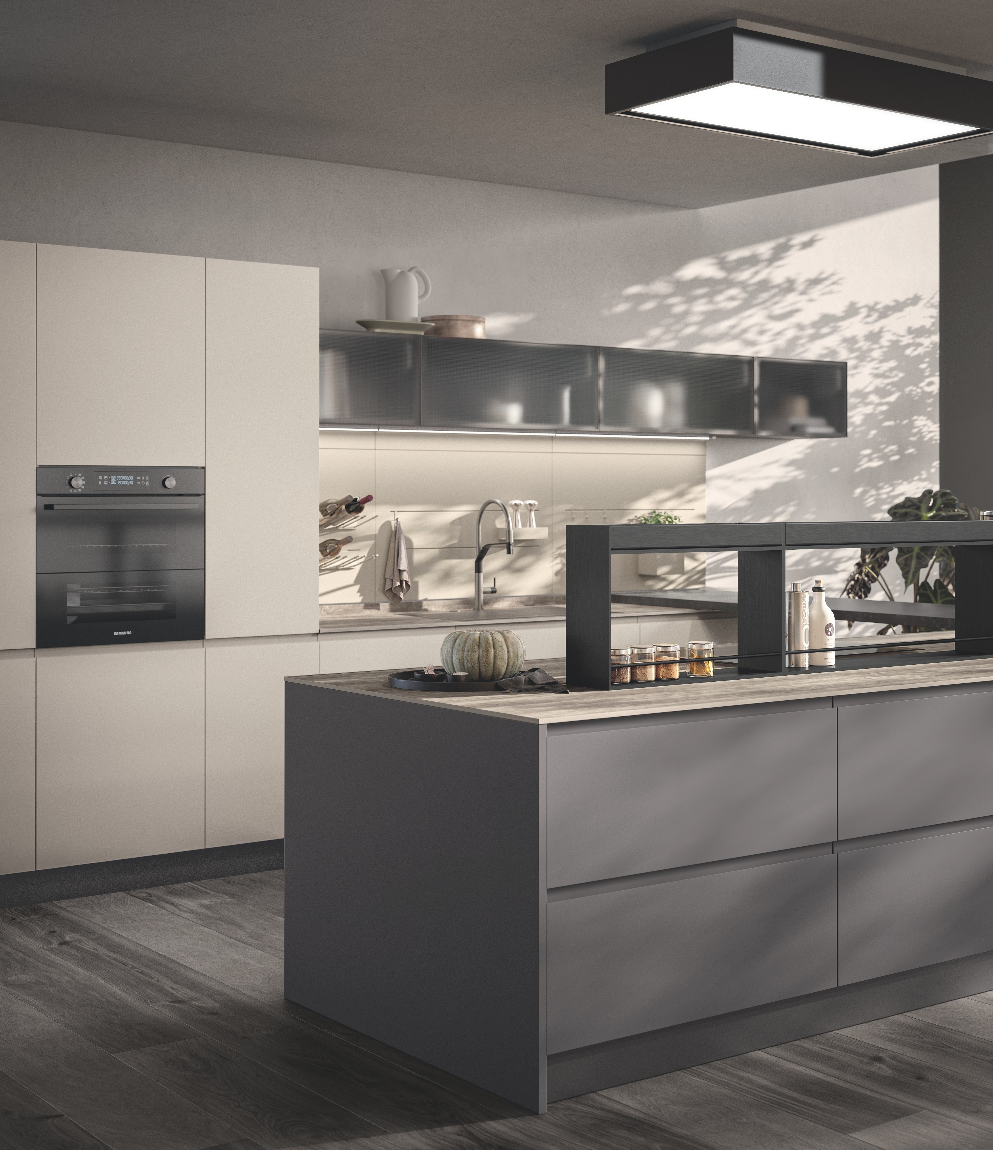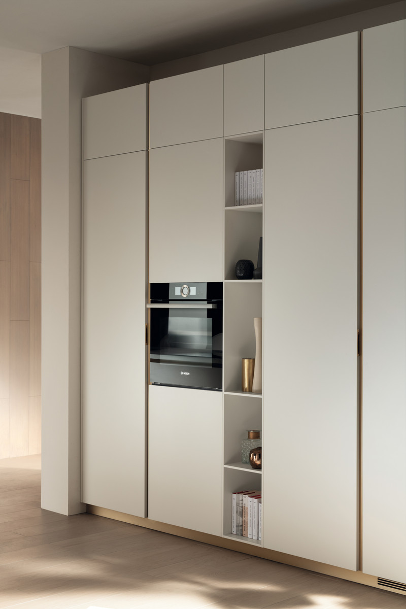 如果细节真的可以令整体脱颖而出,那么即使厨房踢脚线也可以具有突出的造型,成为模块之间的组合元素或独特元素:例子? DeLinea系列带有与家具组合一致的黄铜色饰面,与厨柜的垂直把手槽、把手和高7cm踢脚线完美匹配。