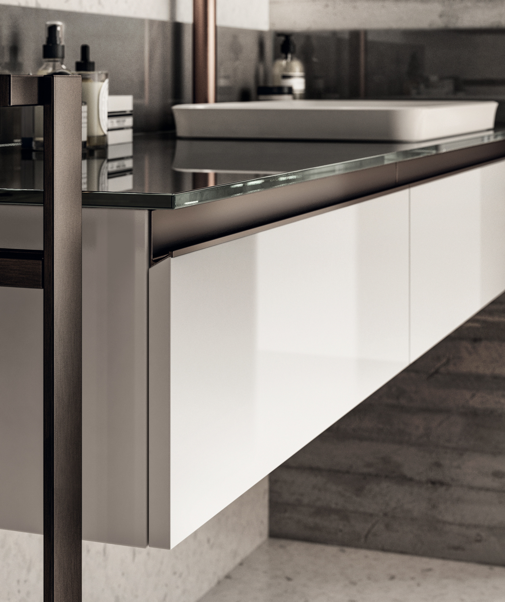 带有嵌入式把手侧面轮廓的门板,体现了这个充满魅力和独特性的浴室系列的真正风格特点。40°把手可实现最大舒适度,饰面可选择黄铜色、青铜色、白色和银色,也可以选择与门板同色的烤漆饰面,尽显高贵优雅。
