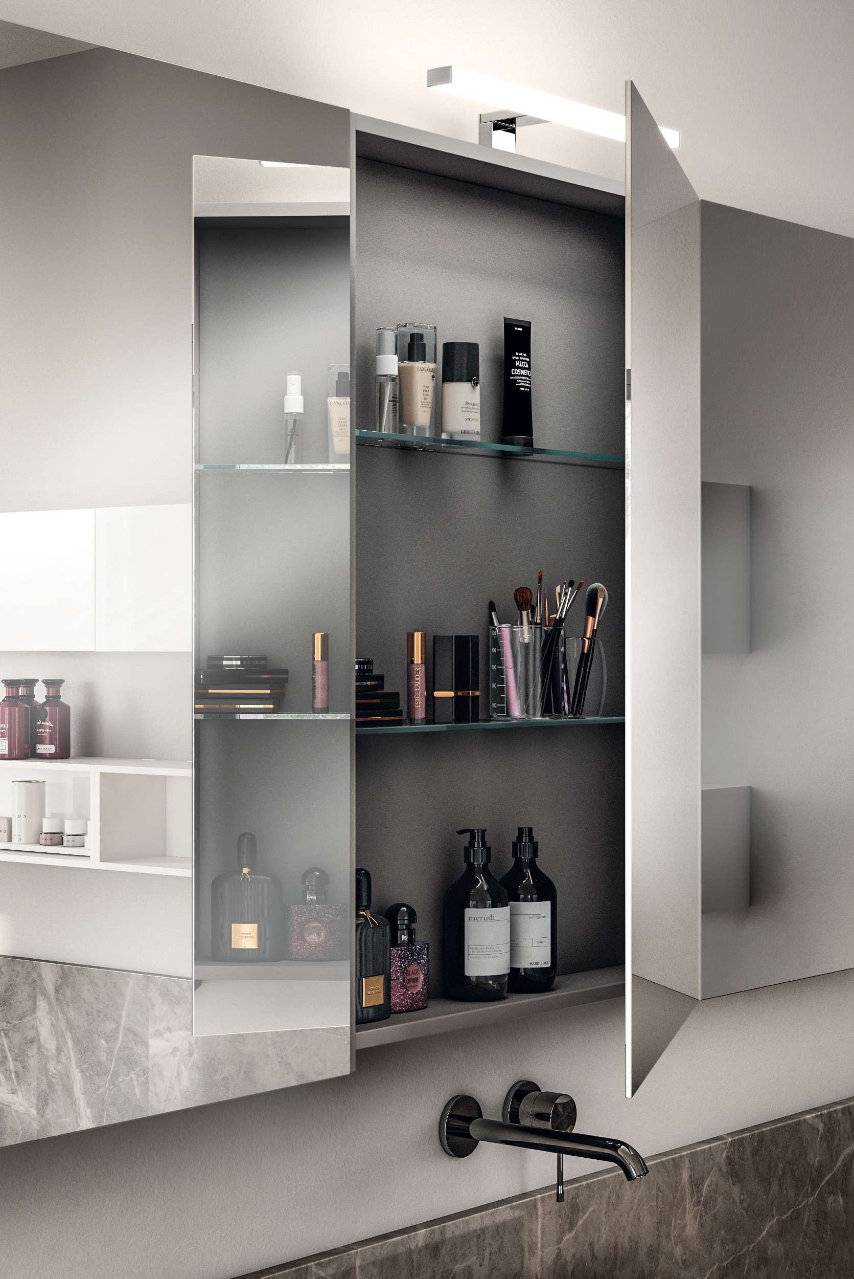 如果化妆品或面霜不要再放入储物柜或层板,您可以随时将所有东西放在储物镜面柜内,就像这个 Juno 系列一样,它点缀以 Racer 镀铬 LED 灯,是这些需要小心保存的产品的最佳盟友。