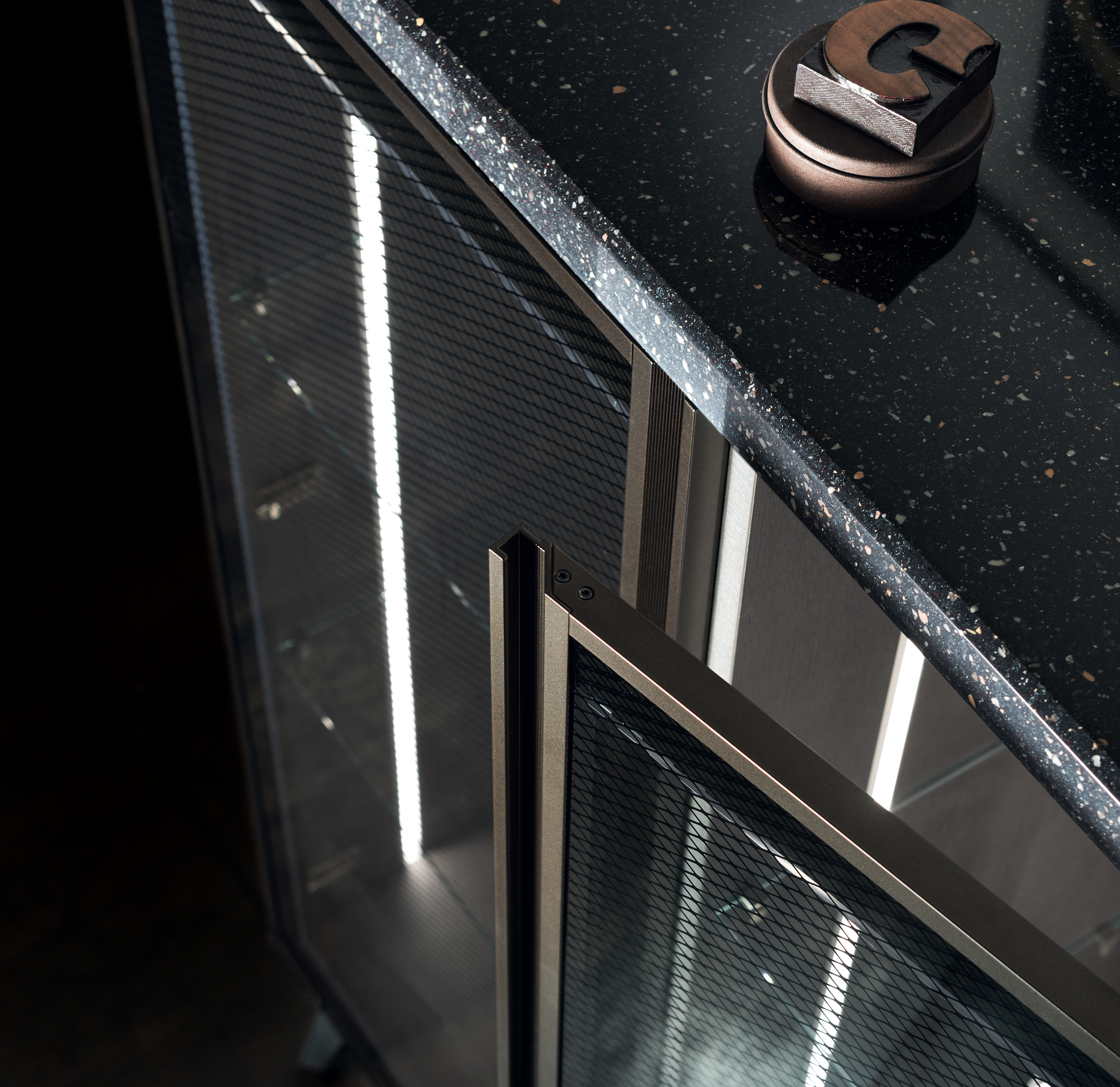 灯光有助于突出空间的某个区域或个别元素。在具有工业味道的Diesel Open Workshop系列中,特点是深色调、暖色渐变以及玻璃门板,整个组合采用相同材料制成,内部点缀垂直Velo Led灯,由于烟熏色玻璃,视觉上带来优雅感。