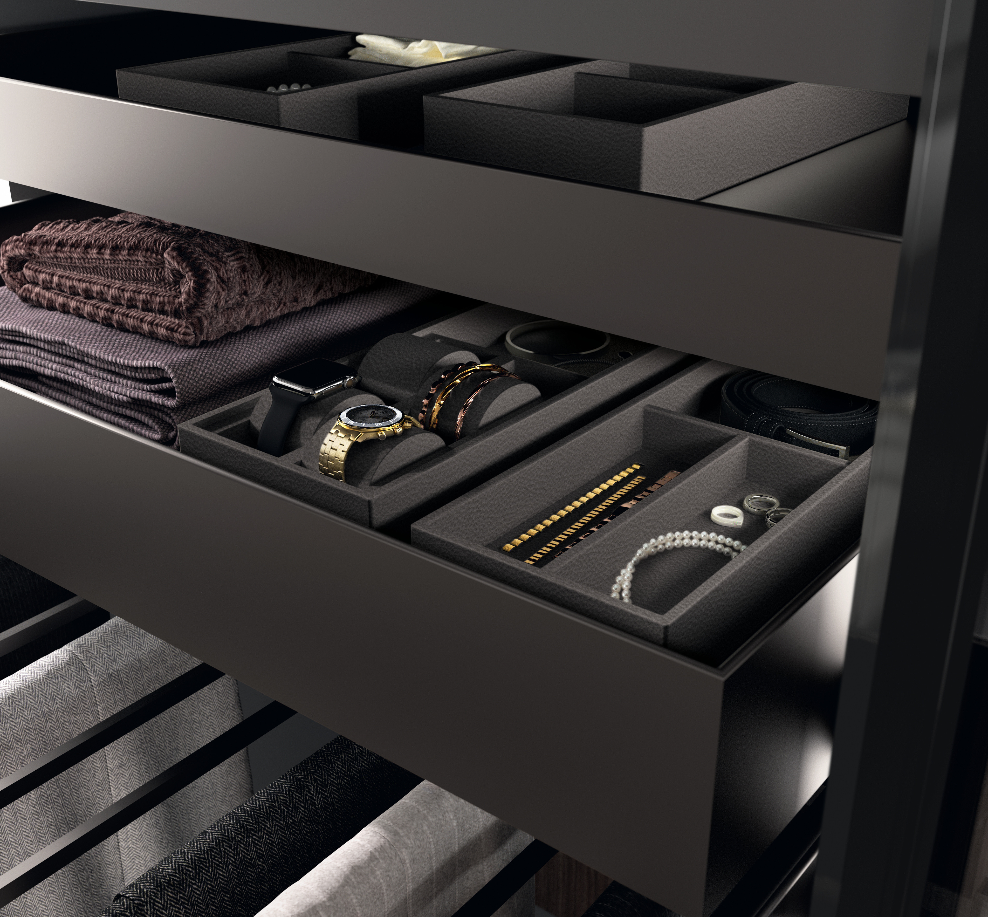 珠宝、腰带和眼镜要放到哪儿去?有了Walk-In Fluida步入式衣柜间,答案便非常简单:您可以将耐用且实用的托盘用作多用途容器,而优雅的托盘用作珠宝盒,让您最贵重的配饰得以保存所有光彩。
