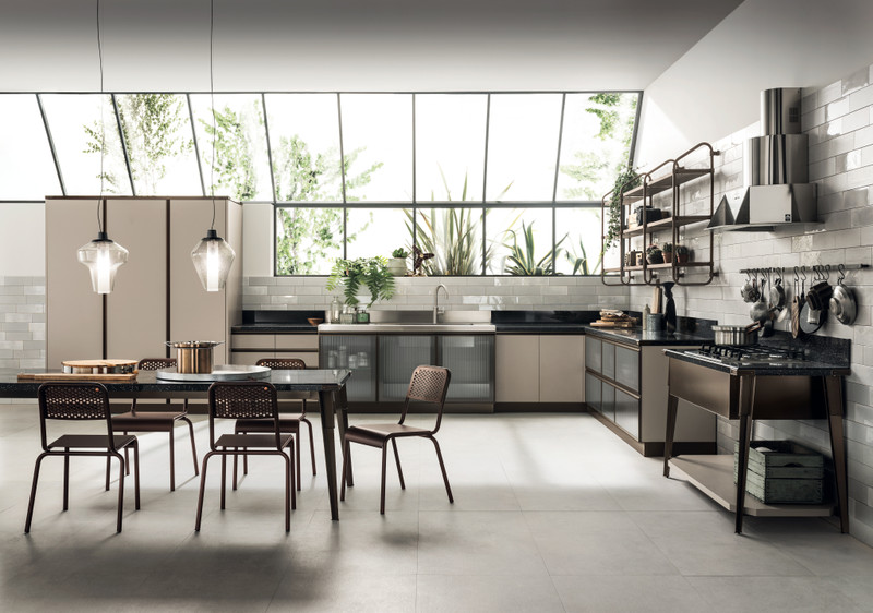 那么,让我们来看第一个无吊柜厨房系列——Jeometrica:在这款转角厨房组合中,吊柜被大面积的落地窗所取代,视野因此延伸开阔,可以欣赏到迷人的秋日景色。整体设计经过精心考虑,旨在营造一种视觉平衡感:哑光烤漆地柜沿水平方向延伸,而采用木纹效果的大型储物柜则垂直占据另一侧墙面,从而在视觉上为空间增添了深度。如果你向往一个明亮、整洁又温馨的厨房空间,那么Scavolini的Jeometrica无吊柜厨房将是理想之选。此系列的设计与家居的装饰元素完美融合,共同营造出和谐而舒适的生活氛围。