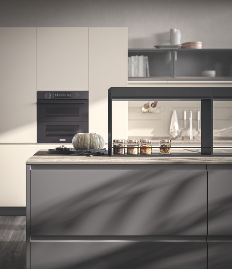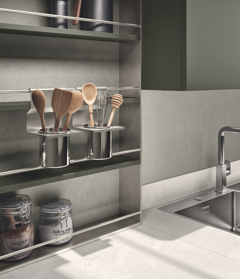 Setup系统带有下部、上部垂直和/或水平模块的Sign配件杆的空间:看看它们如何完美地构建工作区,使每个有用的物品都放置得触手可及:从勺子到酱汁和香料,为您创作的菜肴增色添香。