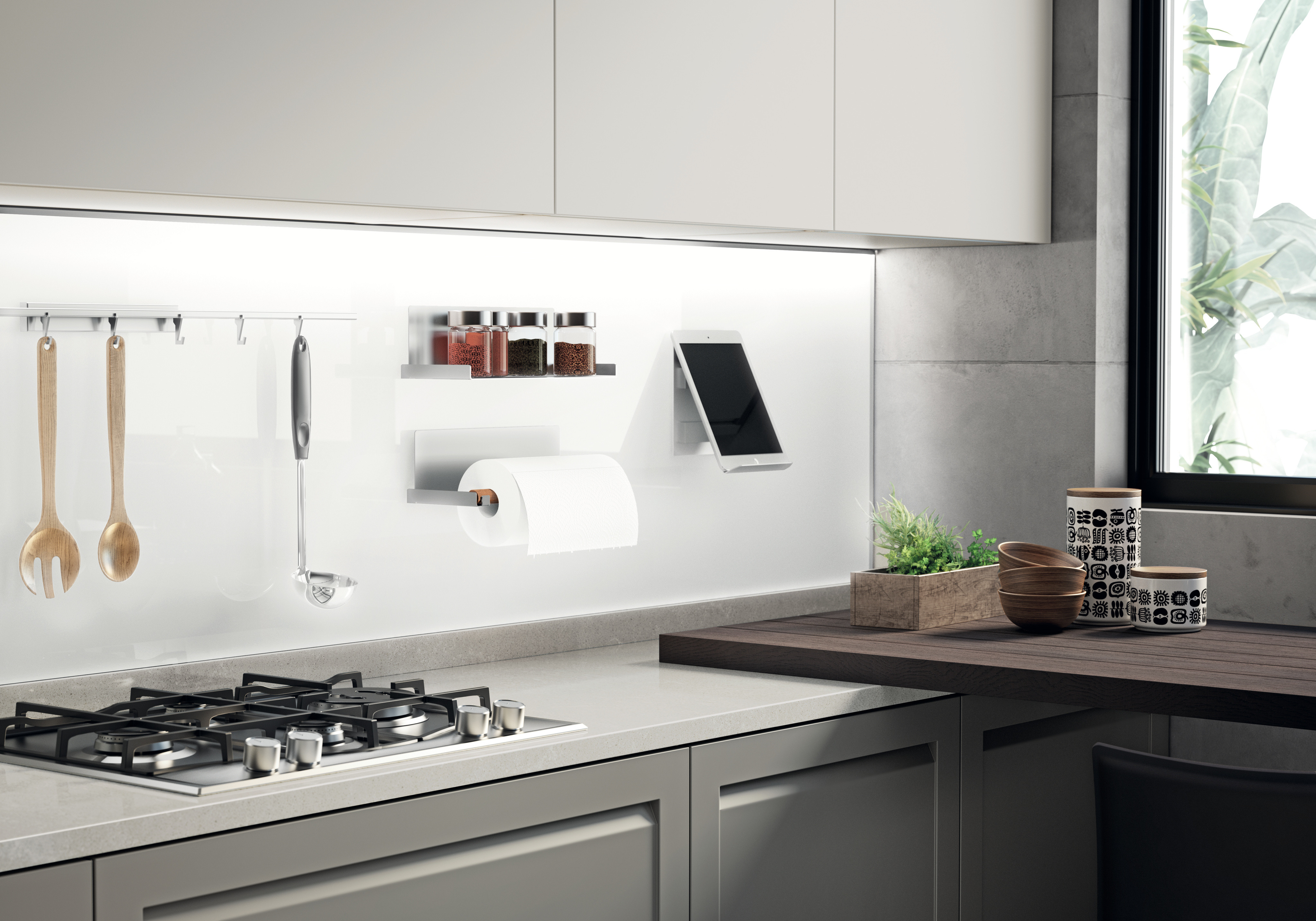 您是否为厨房选择了现代风格?布置现代风格的环境还意味着选择高科技配件,除了装饰之外,还可以保证高效率:您是否知道可以为厨房提供发光玻璃磁性背板,以便照亮台面并在必要时更改厨具的放置方式?Carattere系列的“Orizzonte”背板提供 各种磁性配件:配件杆、置物搁板、厨房卷纸架和平板电脑架或书架。
