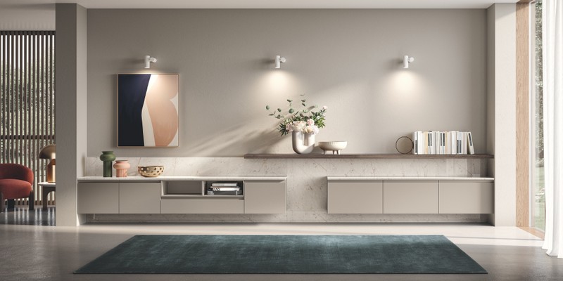 起居室的组合家具,可放置在墙壁上或房间中央,展现出完美的风格,不仅为开放式隔间和下翻门提供空间,也为特别设计元素和抽拉式拉篮提供空间。重要的是在布置起居室家具时,优化其功能实用性,以一种沉着的姿态,为精心制作的意大利风格建筑作品赋予新的生命。