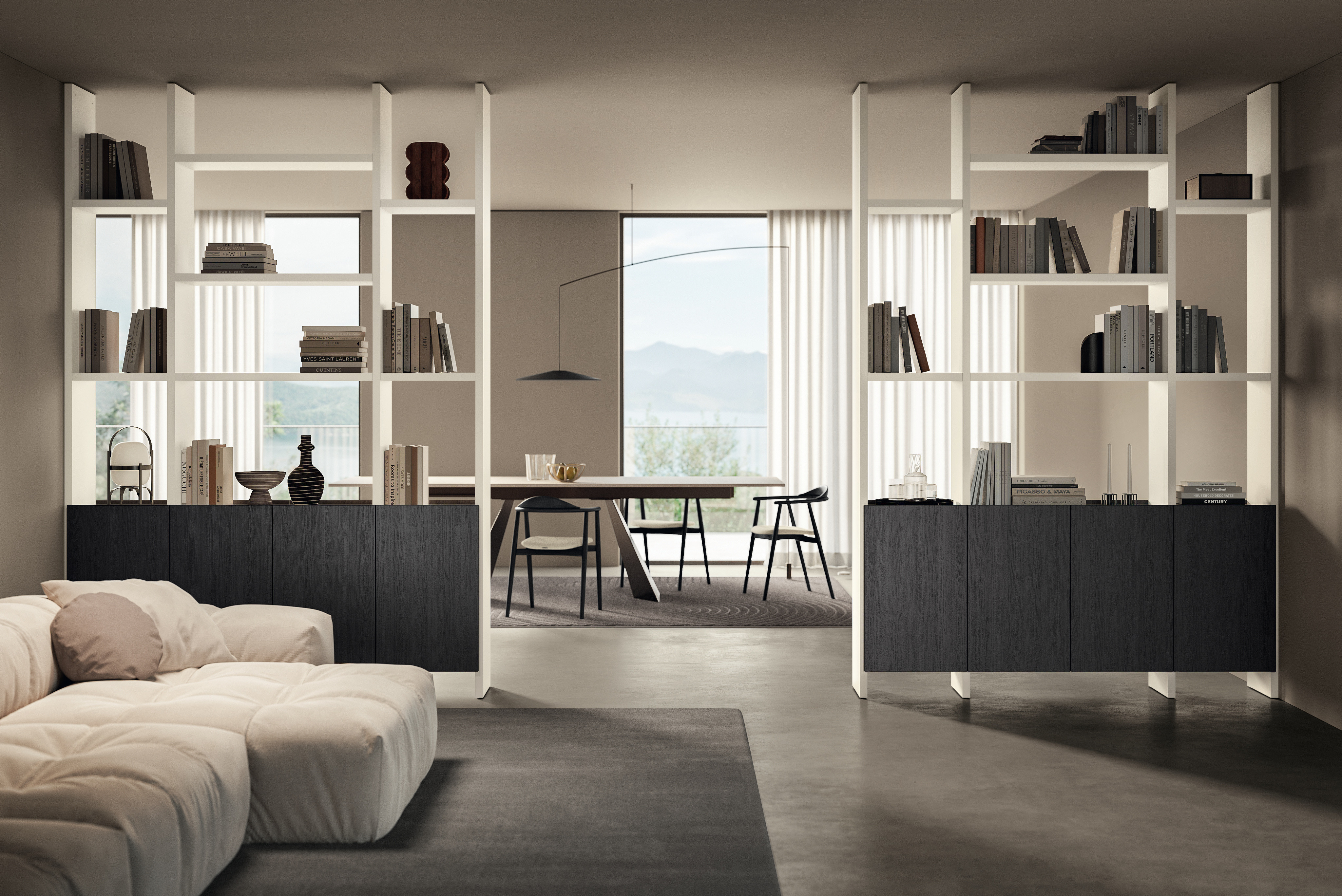 如今,提到“现代厨房”,我们自然会联想到开放而流动的空间布局。Essenza系列正是顺应这一趋势,提供多种方案,灵活连接或分隔厨房与起居室,打造一个既和谐又温馨的开放空间,让美感成为真正的主角。看看这个Fluida隔墙系统的巧妙应用:它不仅是一面配备齐全的墙壁,更是一件设计家具,它不仅划分空间,还能装饰空间,令人赞叹!