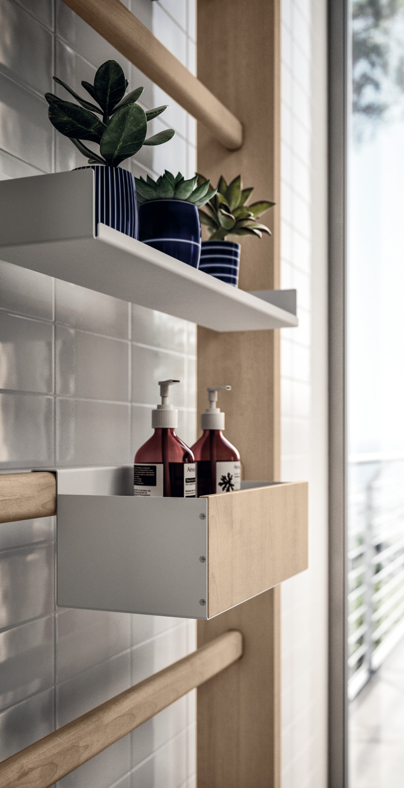 你选择搁板是不是在计划为浴室进行整体改造?我们给你一个灵感:何不打造一个壁挂式结构,根据需要自由搭配各种收纳搁板?该壁挂式结构是一种体操墙杆,是 Gym Space 项目的核心元素,将个人护理与运动锻炼的理念相结合,打造出一个符合现代生活节奏的浴室空间。以下是一些浴室组合示例,你可以在 Scavolini 的帮助下进行个性化设计!