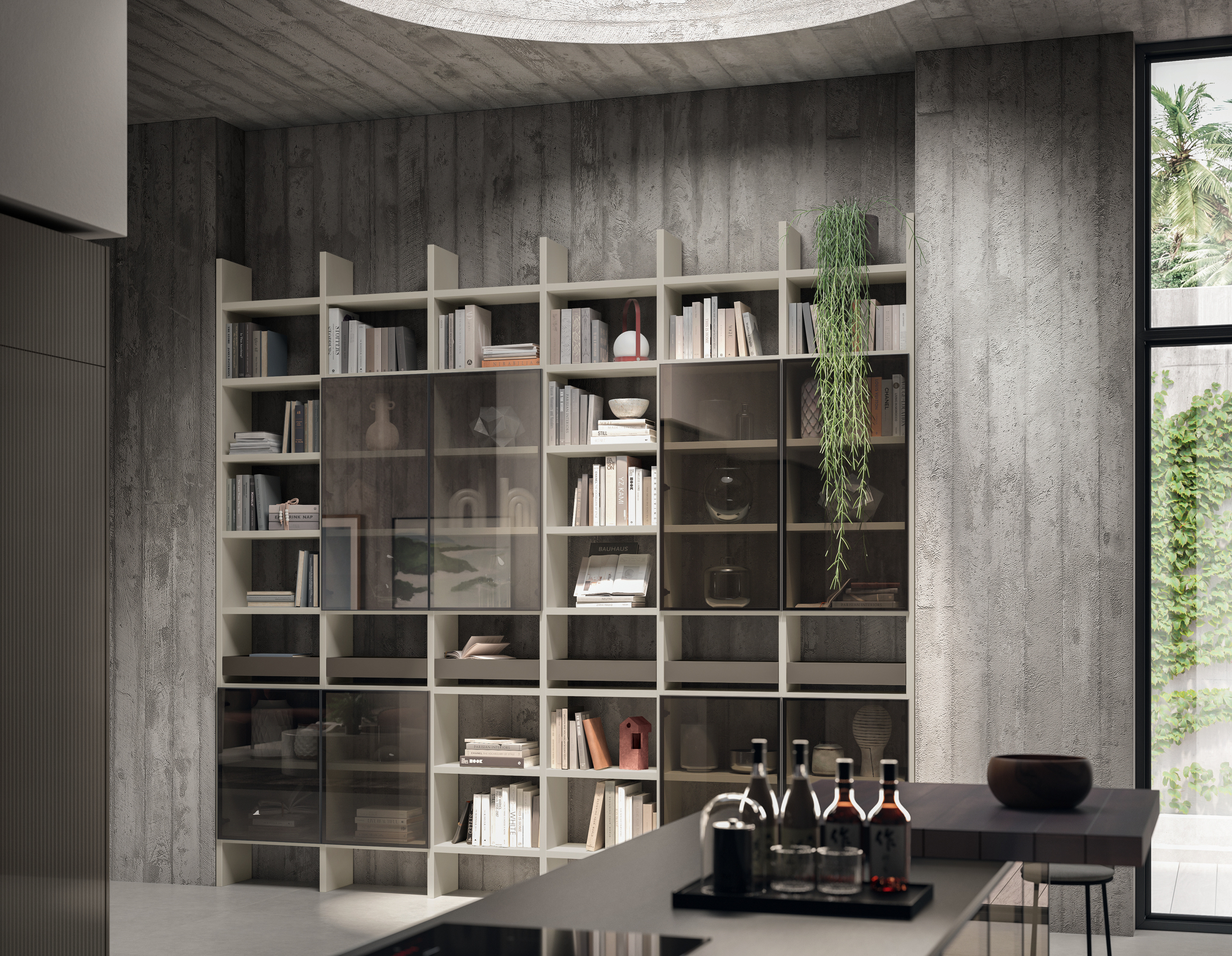 在这个环境中,Scavolini起居室的墙面系统也非常合适:它们的结构完全可定制,提供足够的空间来放置你需要的一切。你更喜欢现代设计,还是也可以考虑创建一个适合智能办公的工作区?”