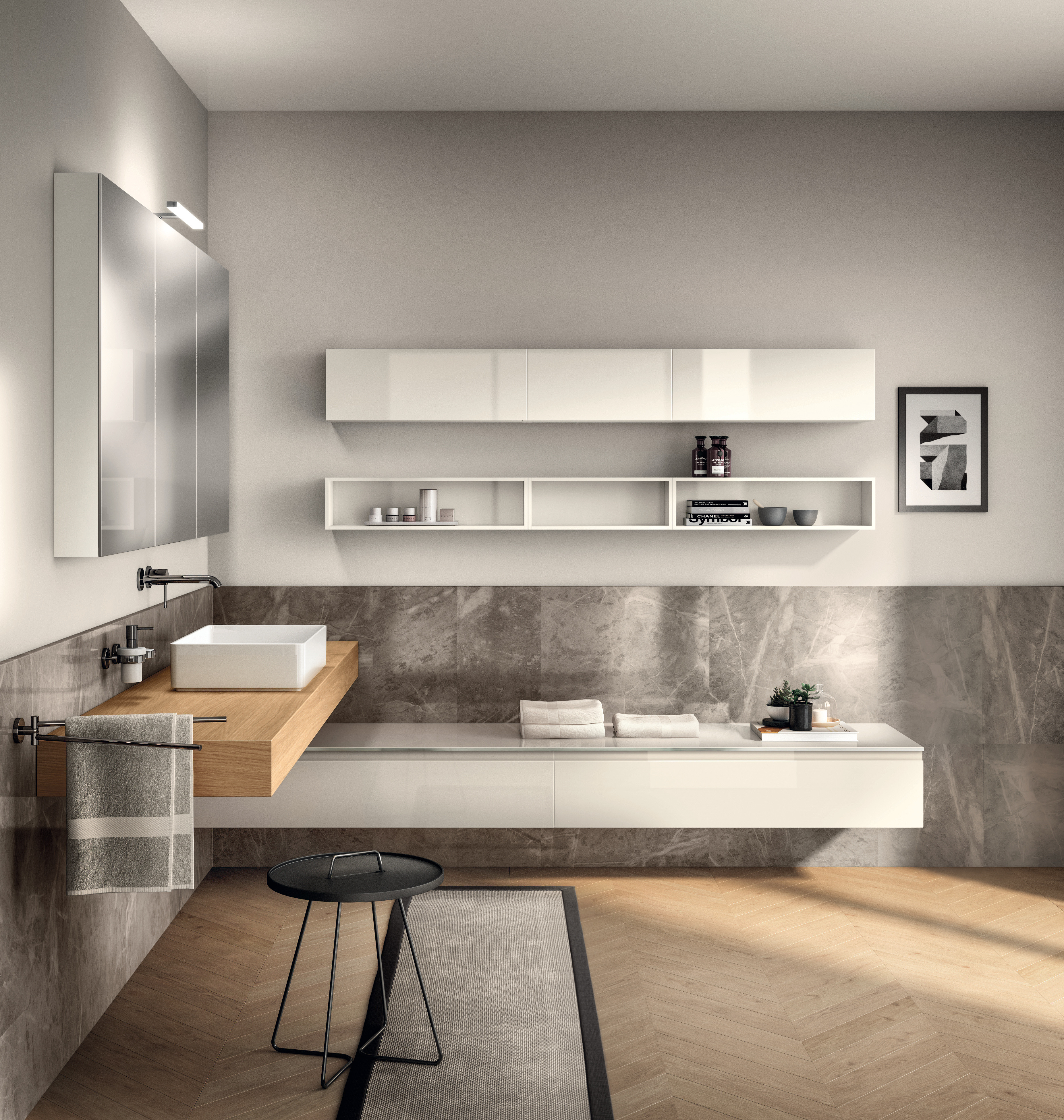 这个空间采用Line System墙面系统的简约设计进行装饰。这是一个横向灵活的系统,为Tratto浴室系列创造了多种组合可能。
