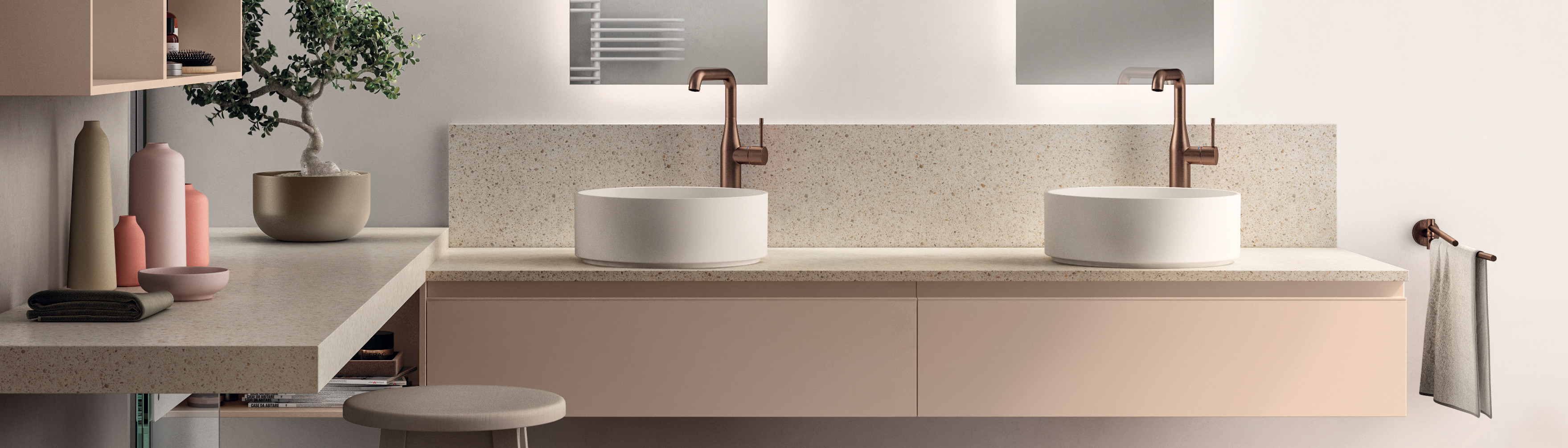 好消息是:并不一定需要一个大浴室。通常,安装一个一体式双盥洗盆只需大约 120 至 140 厘米的空间;而若选择两个台上盥洗盆,则至少需要 150 厘米的台面。我们的建议?为了避免家具组合整体显得厚重,不妨选择一款悬挂式双盥洗盆浴室柜:这种“漂浮感”设计不仅释放了地板空间,方便日常清洁,也能让小浴室在视觉上显得更宽敞、轻盈。
