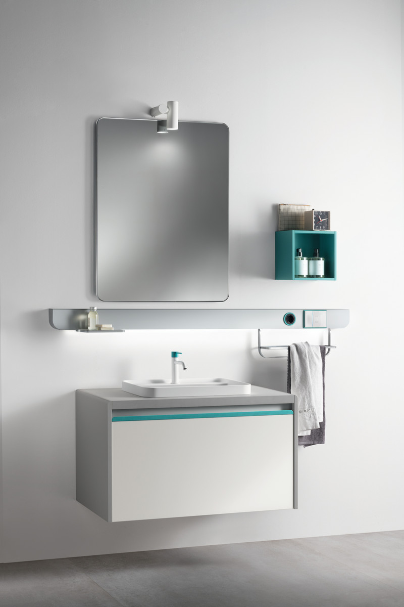 Aquo系列提出带背光元素的款式美观而高雅,它环绕盥洗盆的设计可放置所有的卫浴物品包括毛巾,构建出一个保健空间。