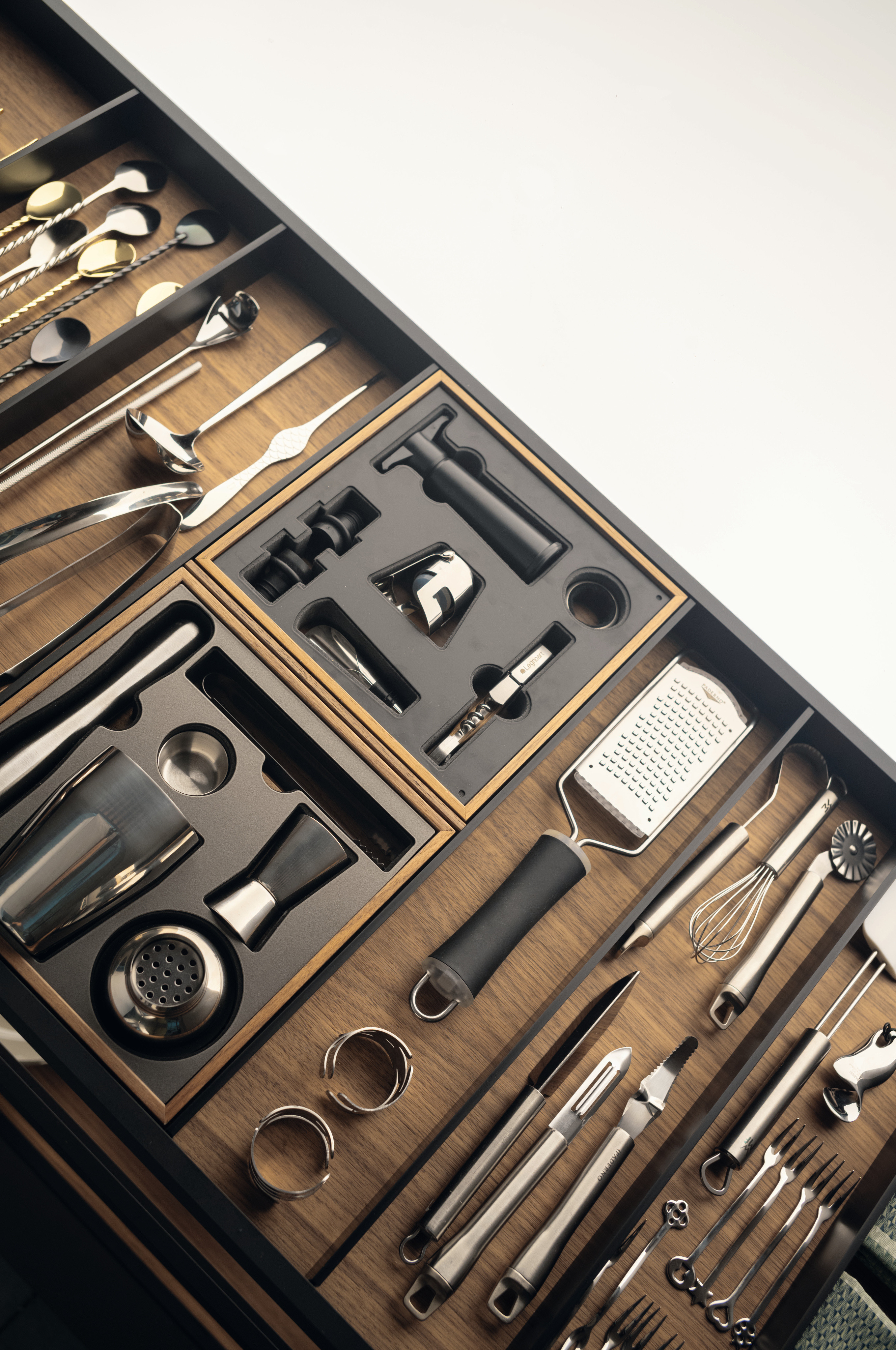 摆放砧板和专业刀具的空间,拥有擦菜板、意面切割滚轮、土豆削皮器和坚果夹形状的插槽只是厨房用具制造商们能够提供的众多选择之一。