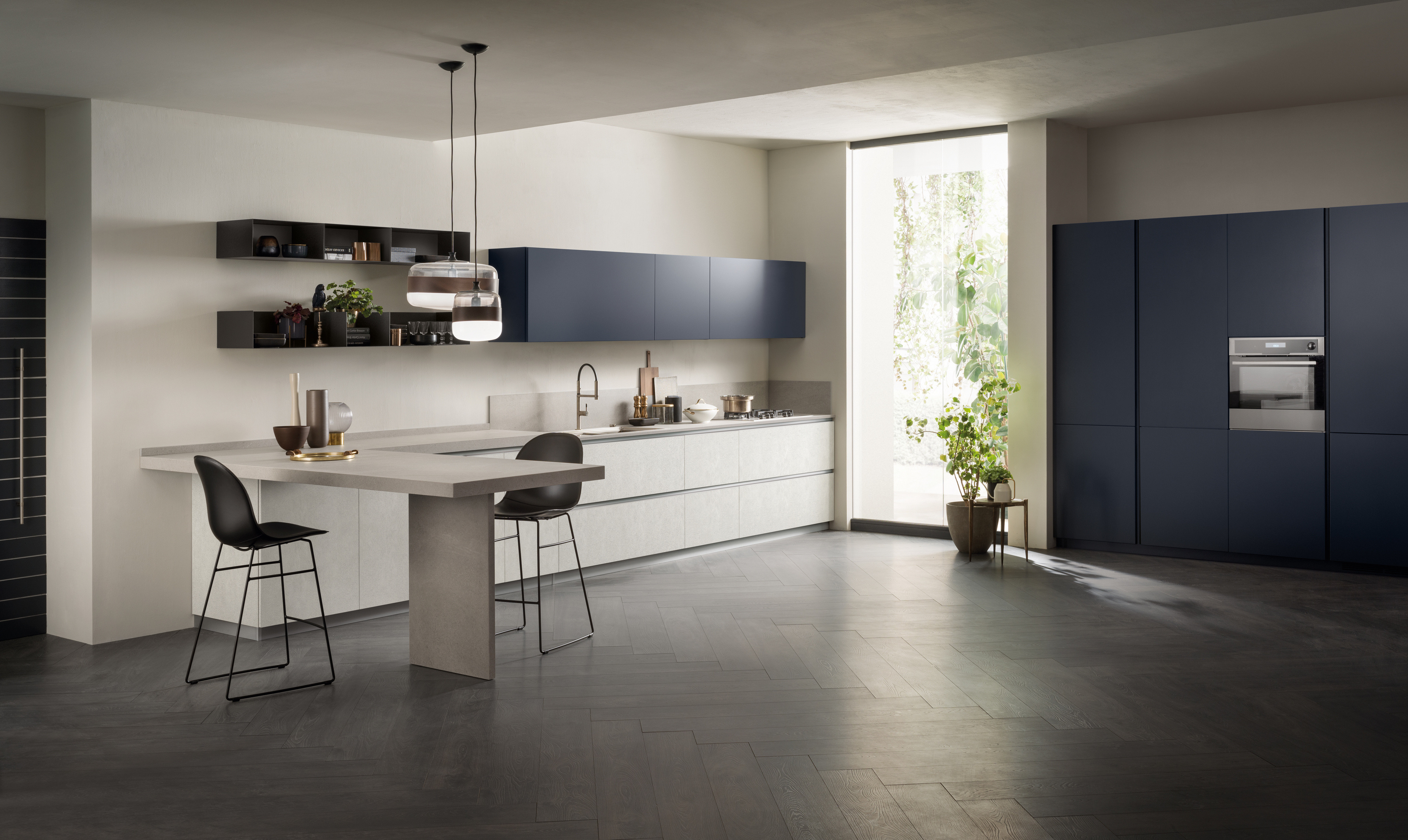 精致考究的色彩组合,让您可以使用或鲜艳强烈的色彩,或中性色调为主的简约色彩,打造都市风格的环境。各种细节体现了功能性和美观性的完美结合:从设备齐全的“Setup”护墙板,到配备了嵌入式餐桌和喷漆金属吊柜结合倾斜门板吊柜的中岛解决方案,直到用于电器和洗碗机的大容量高柜。