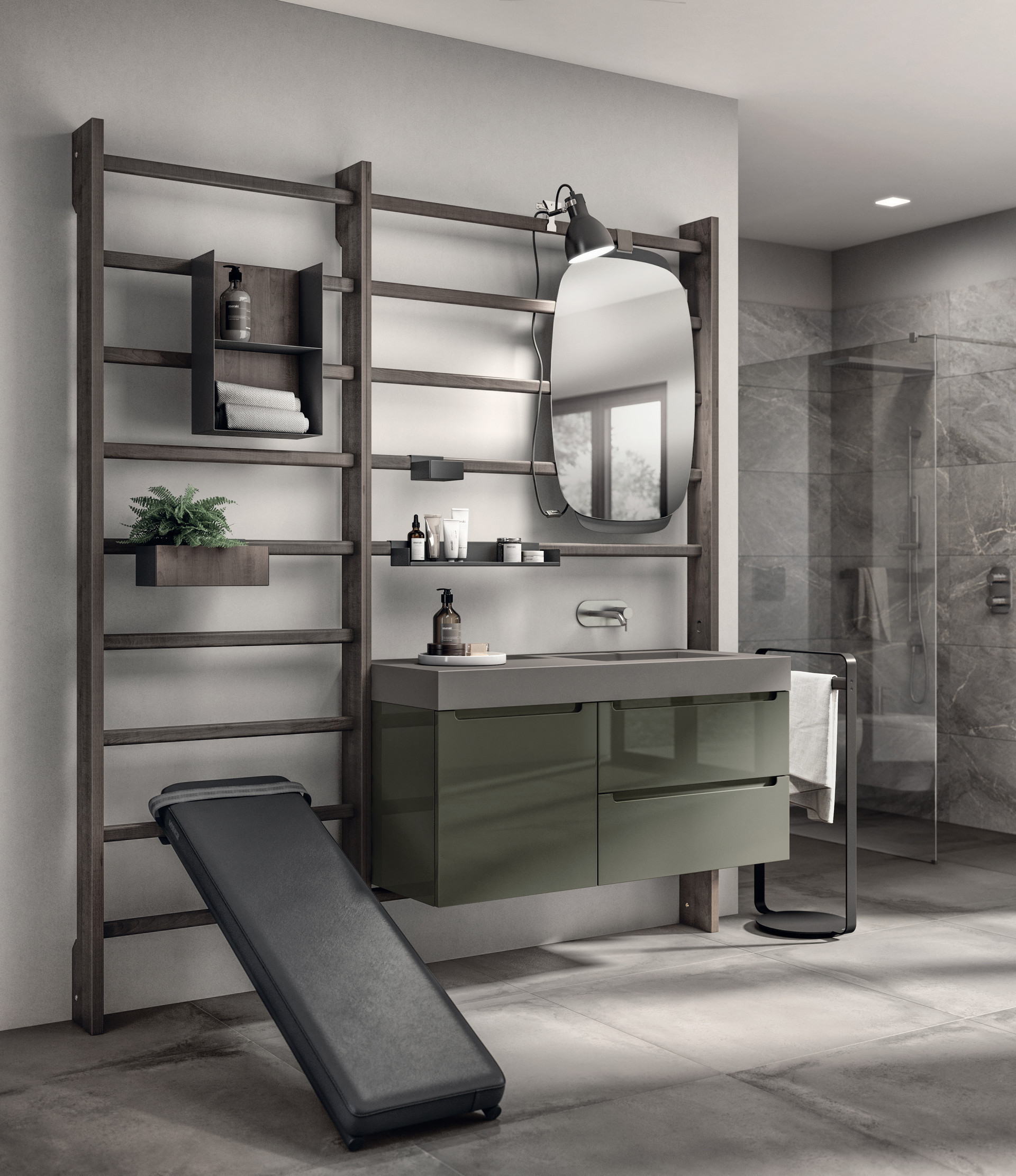 Scavolini是卓越的意大利制造,设计之于Scavolini,是惊喜、试验和对细节的关注。这个由Mattia Pareschi设计的新项目引入了健身角,使用健身器材来保持身材和健康,定义了一种新的构思浴室空间概念。