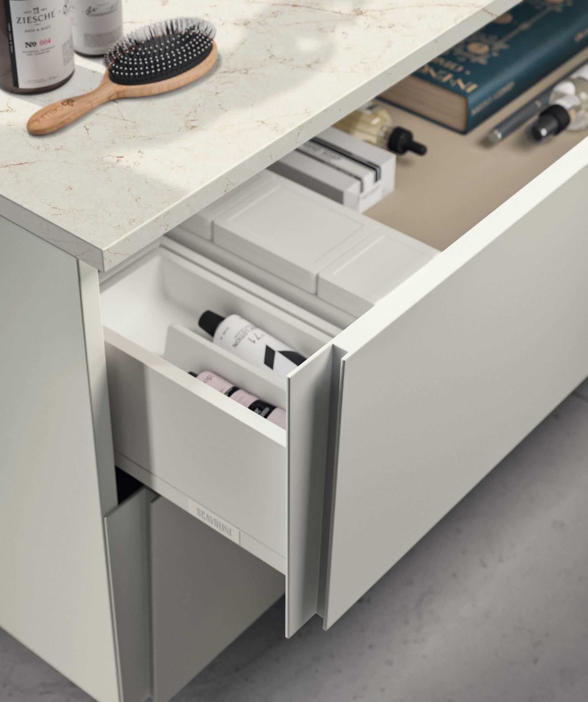 Lagu系列的独特之处在于其带有倾斜式垂直把手的门板。吊柜和高柜仅为此系列而设,呈现特殊的切割造型,两款家具皆 提供相同类型的图形细节。Lagu系列有亮光烤漆和哑光烤漆版本,还为您提供大量的定制可能性,致力为这个家中最私密的空间变得独一无二和温馨舒适。