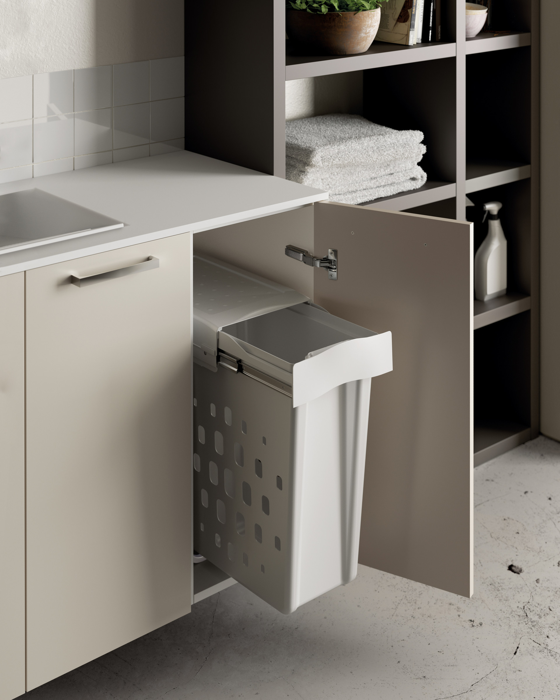 Idro. Composition with Titanium Grey matt lacquered doors and Prestige White matt lacquered open-fronted elements. Around revolving wall in White Decorative Melamine